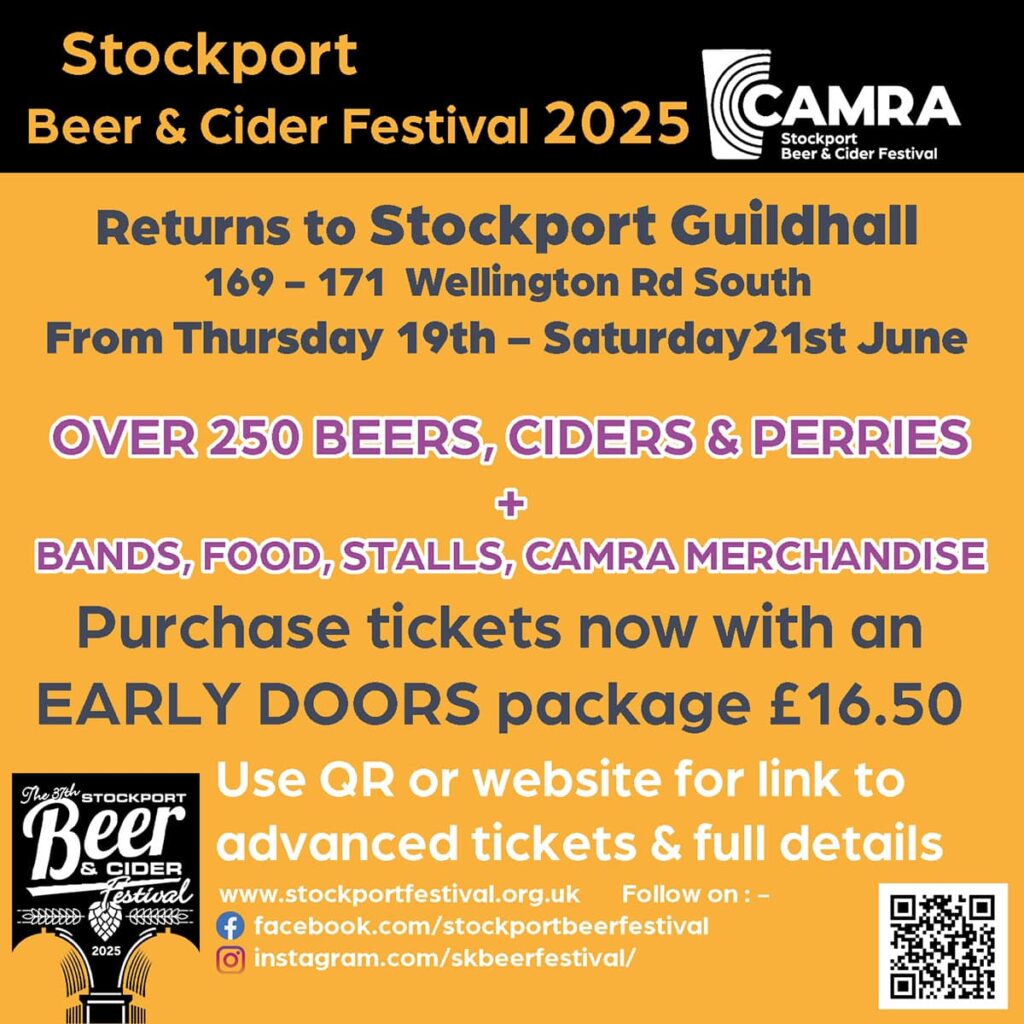 The 37th Stockport Beer and Cider Festival is being held at the Guildhall on Thursday 19th to Saturday 21st June 2025. Over 250 beers, ciders and perries plus bands, food, stalls and CAMRA merchandise. For more information and ticket sales, see the festival Facebook page or the festival website.